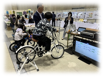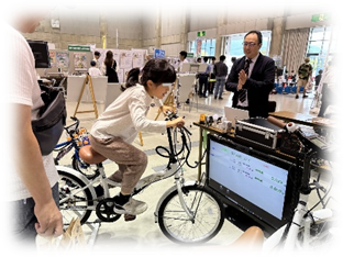研究中の水素アシスト自転車も展示(水素も家庭で作る)や自転車をこいで人力発電の体験