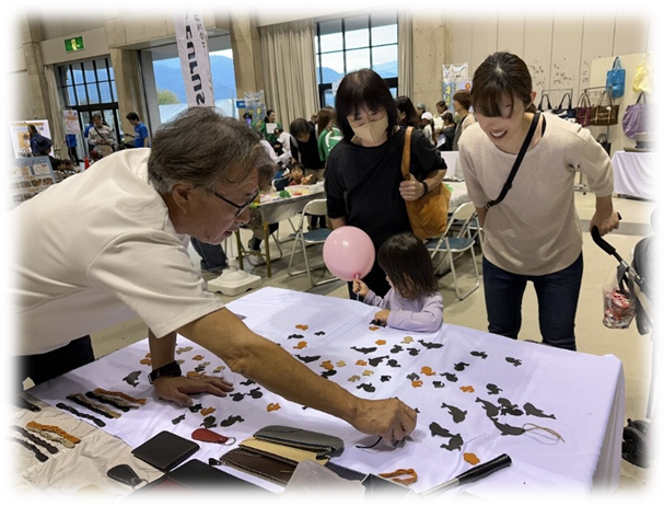 使用済み自動車の皮シートを活用したクラフト作りも人気がありました。